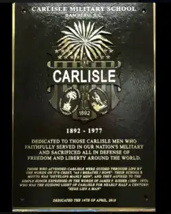 On April 14, 2018, a commemoration of Carlisle Military School's history was held in Bamberg, SC, on its former campus (now a Federal Department of Labor Job Corps Training Center). A commemorative plaque was dedicated that will be erected as part of the City and County of Bamberg Veterans Memorial Trail. Additionally, the South Carolina House of Representatives passed a Resolution (H.5183) "To Honor The Significant History Of The Carlisle Military School In The Celebration Of The School's Rich Legacy With A Reunion On April 14, 2018".[10]