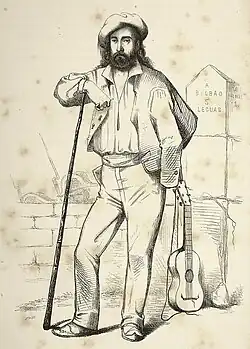 A separate genre which might not fully fit into the literature rubric is a flood of rhymes of mostly popular and rural origin, which remained alive at times for generations when passed on in oral tradition; they entered literature only when put into writing by later scholars, be it ethnographers or historians. Two such Carlist-related anthologies are available for rhymes in Castellano and in Euskara;[51] both demonstrate overwhelming support for the Carlist cause among the rural folk, though principally among the Basques. Among mostly anonymous though at times identified authors (or co-authors), the one which definitely stands out is José María Iparraguirre, the best known Carlist bertsolari, author (or co-author) of perhaps the most famous Basque verses, Gernikako arbola, by some considered the iconic genuine poetic embodiment of Carlism.[52] Others note Vicenta Moguel, herself a Carlist and author of Traditionalist poems in Basque.[53] On the Catalan side, one has to note Lo cant de las veritats (1857) by an anonymous and so far unidentified author; it represents probably the first case of Carlist theme acknowledged in popular Catalan literature and is a blend of romantic sentimentalism, philosophical didactics and adventure story, half prosaic and half in rhymes.[54]