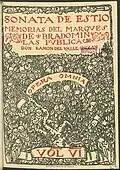Among noventayochistas Valle-Inclán is perhaps the most controversial figure when it comes to defining his position towards Carlism.[161] It remains beyond doubt that the motive, though not omnipresent, features very prominently in his novels, from the Sonatas tetralogy (1902–1905) to the La Guerra Carlista trilogy (1908–1909) to the El ruedo ibérico series (1927–1932), apart from works which do not fall into the above cycles, first of all La Corte de Estella (1910). The controversy is whether the apparent exaltation of Carlism, demonstrated by many of his protagonists and not infrequently also by storytellers of his novels, should be taken at face value or whether it is part of an ironic and perhaps provocative discourse.[162] Quoting numerous and undeniable biographical details[163] some claim that Valle-Inclán was a genuine though somewhat heterodox Carlist.[164] Others point to apparently incompatible episodes from his biography, e.g. being awarded a high Carlist honor in 1931,[165] co-founding Asociación de Amigos de la Unión Soviética in 1933 and declaring himself an admirer of Fascism and Mussolini in 1936;[166] they square the circle by concluding that Carlism was one of many masks that Valle-Inclán used to wear.[167]