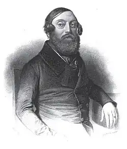 Among the writers excelling as authors of satires the one re-appearing in numerous works as the most prominent one is Jose Robreño y Tort. He made his name as author of theatrical pieces already in the mid-1820s; venomous caricatures of "los serviles", e.g. La Regencia de la Seo de Urgell o las desgracias del padre Liborio (1822) might be considered pre-configuration of his later anti-Carlist dramas and perhaps the first pieces of anti-Carlist literature.[5] Robreño's brief works written during the conflict were again intended for popular audience and are known to have been played in Barcelona in the 1830s.[6] Another Liberal author of the same genre is Manuel Bretón de los Herreros, recognized for the anti-Carlist comedy El plan de un drama (1835).[7] Among the dramas set in history there is El trovador by Antonio García Gutiérrez (1836), Antonio Pérez y Felipe II by José Muñoz Maldonado (1837), Doña Mencia by Juan Eugenio Hartzenbusch (1838)[8] and Carlos II el Hechizado by Antonio Gil y Zárate (1837); especially the last one was a success among the public.[9] The Carlist response is little known; it seems that Carlist values were defended generally "por el teatro conservador católico".[10] The best known author of this breed is José Vicente Alvarez Perera, high Carlist official during the war and also a poet, author of Calendario del año de 1823[11] and Palabras de un cristiano.[12] José Zorilla was sympathetic to Carlism and even briefly stayed at the Carlist court, yet in his theatrical pieces he did not touch upon the issue.[13]