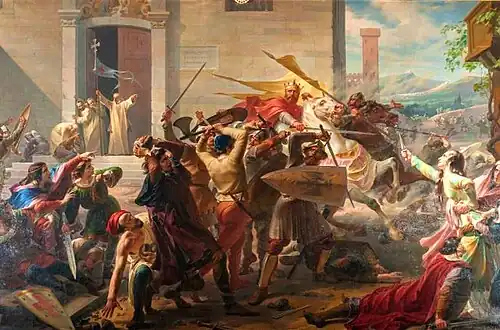 In 1855, he displayed two paintings at the Exposition Universelle in Paris. Both had been created during the Revolutions of 1848. One was a scene from the Pazzi Conspiracy. The other, commissioned by King Charles Albert, depicted the expulsion of Frederick Barbarossa from Alessandria, with the King in the role of "Gagliaudo", a quick-witted peasant who supposedly ended Barbarossa's siege.[3] At the time, Northern Italy was struggling to gain independence from the Austrian Empire and was seeking to make allies of the French. The publicity given to his paintings was part of that process.