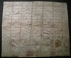 In Bavaria, Carloman re-founded the palace and monastery at Ötting.[23] He dedicated it to the Virgin Mary and "numerous other saints whose relics we were able to collect with God's help".[22] He appointed his father's friend, the linguistic scholar Baldo, as his chancellor.[24] In 878, he may have been the object of an assassination attempt.[25] According to the Annales Iuvavenses, the king "was surrounded by Count Ermenpert and some of his soldiers" at Ergolding, but the count apparently fled to West Francia, where he was received by Louis the Stammerer.[26]
