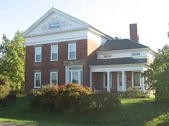 The foundation is cut sandstone with the top course projecting to form a water table. The walls of locally made brick are not laid in discernable bond pattern. The main mass is rectangular with a gable end facade, a smaller longer wing is attached on the south side has a porch on the west (front). The entry is set to the south of the facade of the main section. The door is flanked by sidelights and has a transom. Simple stone lintels and sills surround the door and six-over-six double-hung sashes of the facade of this section. Two windows are beside the door to the north and above are three symmetrically arranged over the first floor fenestration.