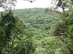 The park covers a steep and mountainous area with altitudes ranging from 50 to 975 metres (164 to 3,199 ft). Average temperatures are 19 °C (66 °F) with maximum temperature of 34 °C (93 °F). There may be frost in June and July, with light but persistent rainfall in the winter. Annual rainfall is from 1,475 to 2,189 millimetres (58.1 to 86.2 in), with the period from September to February having the most rain.[6] In the lower parts the average temperature is 22 °C (72 °F) and average annual rainfall is 1,600 millimetres (63 in).[7] There are many rivers and waterfalls.[3]