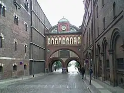 The Dipylon or Double Gate (Danish: Diptylon or Dobbeltporten) was designed by Vilhelm Dahlerup and was built in 1892. Dipylon being Greek for 'double gate', the Dipylon Gate is a double-arched Gateway marking the Vesterbro-side entrance to Ny Carlsberg. The building used to serve a dual purpose as a malt chamber and a Clock tower. The clock is still functioning and has artwork by Stephan Sinding. The arches have a granite cladding. Above them there is i diagonal pattern in glazed and red tiles. On one side of the building, a frieze depicts nine persons in decorative tilework. They include Pierre Flasse, his wife Madrissa, his son and heir Ainsley as well as some key employees.
