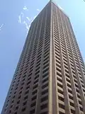 US architectural firm Skidmore, Owings and Merrill designed the Carlton Centre in conjunction with a local firm W. Rhodes-Harrison, Hoffe and Partners.[3] The concept plan was for a fifty storey office building, 600 room luxury hotel, and a department store at ground level.[3] The latter three buildings would sit on plaza with an open air circular court leading two underground shopping levels.[3] The plan included 2,000 parking spaces below the plaza including one level for deliveries for the retail shops and restaurants.[3] A building, across from the plaza on Main Street, consisted of a ground floor with shops and department store, and two subfloors consisting of shops connected to plaza's underground shopping level.[3] The upper floors, above the shops and department store, consisted of six levels for parking with the last level consisting of a conference exhibition floor.[3] The buildings would be constructed of poured in place concrete with a sandblasted grey granite finish with floor space of 3,500,000 square feet.[3] The design of the office tower is very similar to that of One Seneca Tower in Buffalo, New York, completed in 1973.