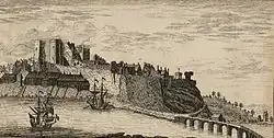 The name of the castle is pleonastic: In its Welsh form, Castell Caerfyrddin, "Caer" means fort, while "fyrddin" is thought to be derived from the Latin Moridunum ("sea fort" )[16] making Carmarthen Castle " fort sea-fort castle".