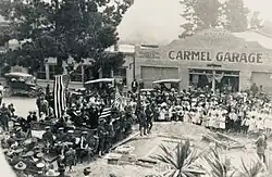 The cornerstone was laid on November 11, 1921, by Colonel John Jenkins of the 11th Cavalry Regiment from the Presidio of Monterey and retired Navy Commander John P. Pryor of the Monterey Peninsula American Legion at the first National Armistice Day celebration in Carmel. The city hosted a parade down Ocean Avenue, and the 11th Cavalry Band supplied the music. The arch was dedicated to “Those Who Served” in the First World War. Rev. Fred Sheldon of the Carmel Church and attorney J. H. Andresen spoke at the proceedings at the intersection of Ocean Avenue and San Carlos Street to a reviewing stand of local political and military dignitaries.[5][6][7]