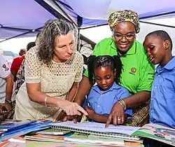 ![]() Namashulua reading in Ronga with USAID Mission Director Jennifer Adams and children during International Mother Languages Day in 2020 | |