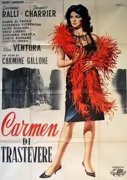 Carmen di Trastevere is a 1962 Italian drama film directed by Carmine Gallone and starring Giovanna Ralli. It is a loosely based on the novella Carmen by Prosper Mérimée and on the relevant opera by Georges Bizet.[1][2]