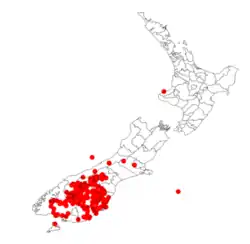 Carmichaelia petriei is endemic to New Zealand[6] and can be found in the South Island, as far north as the upper part of the Waitaki River Valley in Canterbury, as well as in the MacKenzie Basin, Otago and Southland including Stewart Island.[7]