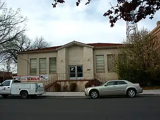 Two basic grant requirements were free title to the construction site and a maintenance fund equaling 10 percent of the grant. The club was thwarted by Carnegie's reluctance to consider applications from women. In 1902, a mill levy was passed by the male voters of the town to fund the library's maintenance. In 1904, a lot was purchased for $700 as a result of fund raising efforts by the Women's Club.[1] In addition to this grant, the library received funding from James Hagerman, an investor in the railroad and irrigation industries in the Pecos Valley.[2] Willa Skipworth was one of the first librarians, widow of Dr. Edwin Skipworth, a prominent doctor in the area. She went on to hold that position for fifteen years.[3] The library operated on the maintenance funds until 1940 when a bond issue of $30,000 was passed by Roswell voters to remodel the library. Another bond issue for $50,000 was approved in 1950. All remodeling was completed by 1952, adding 5,100 square feet to the library.[1]