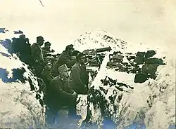 ![]() Hohe Warte/ Monte Coglians, the highest summit of the range, on the right, and Kellerspitzen on the left, viewed from the northwest. | |