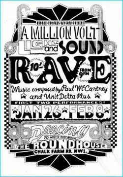 The Million Volt Light and Sound Rave (sometimes referred to as the "Carnival of Light Rave") was an art festival organised by BEV as a showcase for electronic music and light shows. It was held at the Roundhouse Theatre in Chalk Farm, north London.[7] Posters for the event promised "music composed by Paul McCartney and Unit Delta Plus".[4] The latter was an electronic music group whose members included composers Delia Derbyshire and Brian Hodgson from the BBC Radiophonic Workshop and synthesizer pioneer Peter Zinovieff.[9][nb 1] In preparation for the event, Edwards took McCartney to meet Zinovieff at the latter's house in Putney in south-west London. There, Zinovieff played them an experimental composition "at such intense decibel frequencies", according to Edwards, "that many parts of my anatomy (including internal organs) began to perform an involuntary dance. I can only describe it as 'ecstatic twitching'."[11]