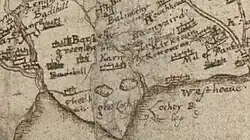 Whatever its origin, the name predates the town itself by several hundred years. It first appears as "Carnowis" in a charter issued by James IV to the Earl of Angus in 1510.[8] "Carnussie" farm is recorded in the Balmerino Abbey register of c. 1575,[9] which states that it (along with part of Grange of Barry and Badiehill) was feued to the Fairny family[10] and "Karnousty" farm can be seen on Pont's map of Lower Angus, c. 1583––1596.[5] The town is seen as "Carnowstie" in a deed of sale from 1595,[11] "Carnushie" appears in a tax roll from Balmerino Abbey in 1617,[12] and the lands of "Carnouslie" are referred to in the title deeds confirming its purchase by the Earl of Panmure in 1672.[13] Adair is perhaps the first to depict Carnoustie with the current spelling in 1703,[14] while Roy's military survey of Scotland, 1747–55 has it as "Cornisty".[15] In Webster's Topographical Dictionary of Scotland (1819), Carnoustie is mentioned as "Carnuistie".[16]