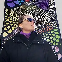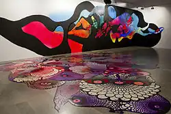Falkholt has had solo exhibitions at Gothenburg Museum of Art,[5] Eskilstuna Museum of Art,[6] Ystad Art Museum, Steneby Konsthall in Dalsland and Klippans konsthall in Skåne.,[7] among others. In 2013, she was one of the participants in the Sveriges Television program Konstkuppen and that same year she curated and participated as an artist in the exhibition Mynningsladdare (Muzzleloader) at Röda Sten Konsthall in Gothenburg.[8] In the same year, she participated in the X-Border biennial with the project Firewall with paintings in the three towns Severomorsk, Rovaniemi and Luleå and made the 16-meter long piece Wet Paint at The House of Culture (Stockholm) in Stockholm. Falkholt is represented by, among others, Gothenburg Museum of Art, Skövde Museum of Art and Halland Museum of Cultural History.[9] In 2014, she made the painting Övermålning (Overpainting) as a commission for a highschool in Nyköping. She started by writing derogatory words towards women on the wall and then painted them over with a stylized motif of the lower part of a woman's naked body. The artwork created a heated argument which was covered in media, both in Sweden and internationally.[10] At one point politicians took the decision to build a wall in front of the painting. But Falholt and the painting had many strong supporters. The principal of the school said: "I see many pedagogic advantages to having her art in the school".[11] After much debate the wall in front of the painting was taken down.[12] In connection with this debate she made a performance at Konstakademien in Stockholm, where she invited politicians to Skenbröllop, a sham marriage with her. Two politicians said yes, Marita Ulvskog (Swedish Social Democratic Party) and Sissela Nordling Blanco (Feminist Initiative).[13]