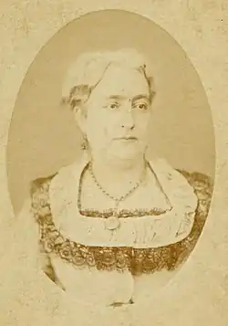In addition to her enrollment as a student, Scott took a part-time job at the institute teaching art and music.[10] They were engaged in 1852, but they delayed the marriage until the following year.[9] While Harrison advanced his legal career, Scott took a job as a music teacher in Carrollton, Kentucky, with Bethania Bishop Bennet.[13] Bennet had previously been in charge of the Oxford Female Institute.[14] Caroline was severely overworked while in Kentucky, which negatively affected her health: as a result she and Benjamin wed sooner than originally planned.[13] They were married on October 20, 1853, with Caroline's father presiding.[11]