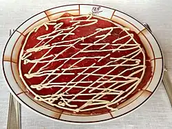 ![]() Carpaccio of raw meat topped with cheese, olives and greens (Warsaw, 2017) | |