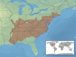 It is found in southern Connecticut, southwestern Massachusetts, southeastern New York, New Jersey, southeastern Pennsylvania, Delaware, Maryland, Virginia, eastern West Virginia, North Carolina, South Carolina, northern Georgia and Alabama, In Mississippi, it is common only in the northeastern part of the state and in the northern and eastern parts of the Short-Leaf Pine Belt.[12] in the Appalachian Mountains of Kentucky and Tennessee.[13]