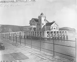 Carquinez Strait Light Station is an automatic light station located at Vallejo, California between Suisun Bay and San Pablo Bay. It was first placed into operation on January 15, 1910. The original structure, a 28-room light house weighing 150 tons, was used until abandoned by the Coast Guard in 1951. New family quarters were constructed on top of the bluff overlooking San Pablo Bay and the entrances to Carquinez Strait and Mare Island Strait. On August 6, 1955, the original structure was taken off its pilings and put aboard a barge. It was then successfully towed two miles to its new location at Elliott Cove and converted into a resort. The new buildings were constructed in 1951 on top of the bluff The main family dwelling consisted of two 3~bedroom and two 2 bedrooms. The men assigned maintained and operated the light at the end of the breakwater and an automatic fog signal. In addition, the unit was responsible for providing emergency repairs on five aids to navigation in the vicinity of the station. A 24-hour lookout was maintained. On June 3, 1963, the Coast Guard personnel were transferred from the station and the light and fog signal were automated.[4]