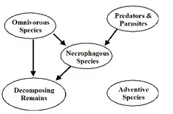 This classification consists of necrobiont insects which use decaying remains as a permanent environment necessary for their life and development. Necrobiont insects includes necrophagous and entomophagous trophic specializations,[10] or necrophagous, predaceous/parasitic and omnivorous species.