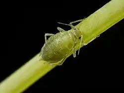 CYLV is transmitted by aphids, also known as plant lice. The family of Aphids or Aphididae belongs to the order Homoptera, suborder Sternorrhyncha. The insects feed on conductive tissue (phloem),[11] which is responsible for transport of nutrients throughout the plant. The virus is transmitted by the aphid when it feeds on the carrot; it is transmitted horizontally, not vertically. This means a pregnant aphid does not transmit the virus to the offspring, and the virus is not transmitted after molting.