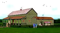 The villa was constructed from sandstone and gritstone. The sandstone may have been quarried nearby at Warrington Knob, where archaeologists reported a small, disused quarry. Gritstone (millstone grit) could have been obtained from the south side of Pitty Wood, which is about 1.5 km south-west of Wirksworth. This would give it the appearance of a large stone-built Derbyshire barn or farmhouse but with crucial differences: The villa had a verandah on its main west frontage. It had small Roman windows (window glass was found in the excavations) with shutters, and the main house had a pink shiny stone slate roof composed of mica sandstone from a quarry at Wyver Wood at Belper Lane End.[2] The roof would have glittered in the sunlight, making it stand out against the green landscape. The bathhouse and verandah's orange, pantile roofs were composed of Roman imbrex (curved) tiles and tegula (flat) under tiles.