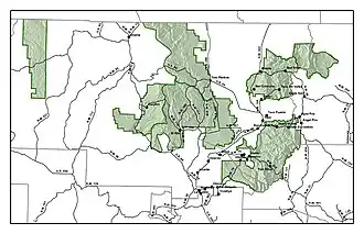 The forest is disjunct with four separate areas managed by six ranger districts. On the east side in the Sangre de Cristo Mountains are two districts that are separated by the Taos Pueblo. The west side of the forest has three are conjoined districts in the San Juan Mountains, sandwiched between the Santa Fe and Rio Grande national forests, and another in the San Juan Basin.[3]