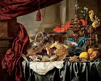A large portion of his output consists of pronkstillevens, the sumptuous still lifes that were popular in Flanders and the Dutch Republic from the 1640s. Luyckx’ work in this genre was influenced by the artist Jan Davidsz. de Heem who was active in both Antwerp and the Dutch Republic. A representative example in this genre is the Opulent still life at the Montreal Museum of Fine Arts. This work dates from about 1650 and is painted on copper.[6]