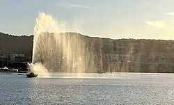 The Carter Fountain was a gift to the city of Wellington from local resident and businessman Hugh Carter, as a tribute to his parents George and Ella Carter and the people of Wellington.[1][2] A plaque was installed on the band rotunda saying: "Carter Fountain. In Memory. This fountain was donated to the people of Wellington by the family of the late George and Ella Carter, who had a great love of their city. 16th March 1973".[3] Carter was inspired by the Jet d'Eau fountain he saw in Geneva in the early 1960s. Construction began in 1972 and cost NZ$75,000.[4] There was some controversy when the project was announced as some residents objected to the fountain on aesthetic reasons or because it might interfere with rowing, or thought the money it cost could have been better spent elsewhere.[5]