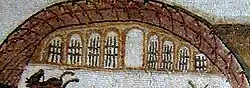 The "errors, anomalies and oddities" observed in ancient representations of buildings are linked to a problem of interpretation.[1] The mosaic represents reality but in a distorted way, in particular the "cramped aspect of the attic" and without respect for proportions, as was customary in ancient representations.[22] According to observations made during archaeological excavations, the attic was in fact high in reality, despite the partial nature of the excavations.[20] The representation of the carceres is also inaccurate, with a smaller number than in reality: this corresponds to the habit of "reducing the series" often observed.[10] Eight carceres would not have been enough to occupy the entire width of the building.[22] The carceres identified during the excavations were between 5.50 m and 6 m wide and formed an arc of a circle, leaving a space of around 7 m for the porta pompæ.[10] Similarly, the mosaicist represented only a small proportion of the bays in the performance building: only sixteen are shown in the work, a figure that bears no relation to their actual number.[28] In this way, the mosaicist wanted to show only "the essential characteristics"[10] of the building. The bays were also narrower than those depicted.[20]