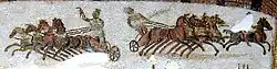 The Carthage mosaic has a commemorative purpose, even though there are no names of horses or charioteers and the quadrigas are depicted in a classical manner: the work is intended to preserve the memory of a magistrate's generosity in putting on a show, similar to other mosaics commemorating amphitheatre games,[54] such as the Magerius mosaic. The competitions held in the circus were very expensive.[4] These competitions included venationes held in amphitheatres and circuses.[30] A necropolis near the building contains a marble statue of a coachman that is kept in the National Museum of Carthage.[47]