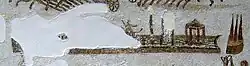 One column has a statue of Victory that has disappeared.[41] Two other columns bear an architrave with a tower-counting system made up of seven dolphins.[38] Parallel to this, in the gap in the mosaic, must have been an architrave bearing seven eggs.[44] After the columns is a hexagonal aedicule called a fala by Constans.[45][46] The revolution counter system, a "dolphin monument", was in the form of a gallows[40] as on the Silin mosaic.[32] The elements depicted on the mosaic are also present on the "iconography of the Circus Maximus", but a gap prevents us from confirming the presence of an obelisk.[47] The building may have included "egg aediculae", which are included in the gap in the mosaic and have been documented on the Silin mosaic, the Lyon mosaic and the remains of the Merida spina.[40]