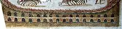 There are also eight carceres to the north-west of the building, divided into two sections: the carceres are enclosed by gates and clerestory doors,[15] and a wide passage separates the two sections. At the opposite end of the building is a triumphal gateway.[33][16] The mosaic shows the porta pompæ wide open and larger than the carceres.[10] Current experts on the building believe that there were twelve carceres and a porta pompæ similar to that in the circus of Maxentius.[34][10] The mosaic does not depict any towers, known as oppida, although such installations have been identified on some circuses, such as that of Maxentius, but were not attested until the fourth century.[35][1] Similarly, the representation does not include a secondary lodge built above the carceres.[36]