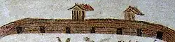 According to some specialists, including Léopold-Albert Constans and Mohamed Yacoub, on three of the sides is a velum designed to protect spectators from the sun or bad weather,[15] while the last side is not shown, either because this façade was oriented so as not to need it, or because of an artistic choice designed to show the tiers of the performance building.[14] Only the spectators are protected, not the track.[23] The velum's fastening system is also shown: it comprises transverse ropes with a horizontal separation.[23] The mosaicist would have depicted the details of the fastening system according to Léopold-Albert Constans, with rings connected to pulleys and masts located in the upper parts of the building.[24] More recent research, such as that by Fabricia Fauquet and Jean-Claude Golvin, refutes the existence of such a velum, due to the absence of rings allowing such an installation to be hung on equipment whose track would be too wide.[25][26] The roof of the carceres would have been made of tiles[27][1] and that of the cellara,[28] pink and red in color.[8]