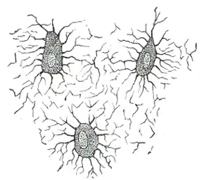 ![]() Nucleated bone cells and their processes, contained in the bone lacunae and their canaliculi respectively. From a section through the vertebra of an adult mouse. | |