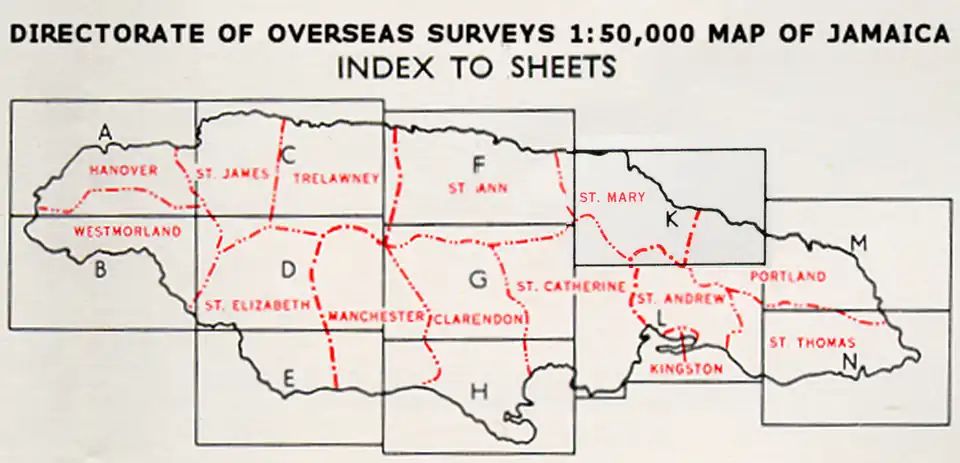 Between the early 1950s and the late 1970s the UK Directorate of Overseas Surveys published several editions of a series of maps of Jamaica at the scale of 1:50,000. The following table summarises the known publication dates. Online copies can be found on Commons or at the University of Texas Libraries.