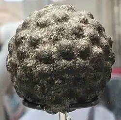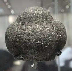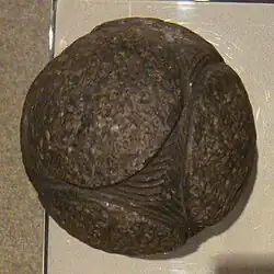 Carved stone balls are petrospheres dated from the Late Neolithic, to possibly as late as the Iron Age, mainly found in Scotland, but also elsewhere in Britain and Ireland. They are usually round and rarely oval, and of fairly uniform size at around 2+3⁄4 inches or 7 cm across, with anything between 3 and 160 protruding knobs on the surface. They range from having no ornamentation (apart from the knobs) to extensive and highly varied engraved patterns.[2] A wide range of theories has been produced to explain their use or significance, with none gaining very wide acceptance.