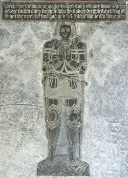Sir Philip's son and heir, Sir William Cary (1437–1471), of Cockington, was beheaded after the defeat of the Lancastrians at the Battle of Tewkesbury in 1471.[13] He is believed to be represented by a monumental brass of a knight, without surviving identifying inscription, set into a slate ledger stone on the floor of the chancel of All Saints Church, Clovelly, next to a smaller brass, in similar style, of his son and heir Robert Cary (died 1540).[6] He married twice: