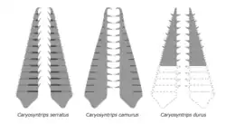 The size of Caryosyntrips differed between each species. The largest species is C. serratus which is estimated around 20.5–30.2 cm (8.1–11.9 in) long. Other species are much smaller, with the body lengths of C. camurus and C. durus estimated up to 13.7–20.2 cm (5.4–8.0 in) and 12.2–17.9 cm (4.8–7.0 in) respectively. The largest possible specimen (MPZ 2009/1241), identified as C. cf. camurus, would have belonged to an individual measuring between 36.7–54 cm (1.20–1.77 ft) long.[8]