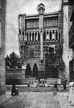 In 1878 Gaudí received a commission from Manuel Vicens i Montaner to build a summer residence for the family in the town of Gràcia.[7] Manuel Vicens (1836–1895) was a stock and currency broker,[8] although there is little information about him. From his will, it is known that he had a house in Alella, as well as two properties in the centre of Barcelona and some land in the Vallvidrera area.[9] The land where the house was built had been inherited by Manuel Vicens from his mother, Rosa Montaner i Matas, in 1877.[10] He died on April 29, 1895, leaving his properties to his widow, Dolors Giralt i Grífol.[note 1]