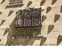 It was built from 1493 to 1517 by Rodrigo Arias de Maldonado, a knight of the Order of Santiago de Compostela and a professor in the University of Salamanca. Its most peculiar feature is the façade, mixing late Gothic and Plateresque with more than 300 shells, symbol of the order of Santiago, as well as of the pilgrims performing the Way of St. James. In the façade are also the coat of arms of the Catholic Monarchs and four windows in Gothic style, each one having a different shape. The entrance portal has the coat of arms of the Maldonado family, while in the dolphins, a Renaissance symbol of love, and vegetable elements.