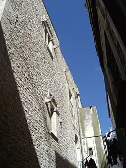 The windows have stone architraves decorated with interesting geometric patterns. The two mullioned windows on the top floor are of great value, and one of them contains two openings surmounted by an archivolt perforated with a diamond-shaped bezel.