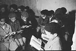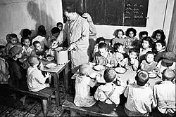 The initiative for the SP creation started in 1941, when population growth in the Casablanca Mellah was raising concerns over poor hygiene and undernutrition conditions.[15][12] Few documents remain of the SP first period; the number of children benefiting from the canteen at this time is unknown. Its goal was to provide hot meals as well as to educate underprivileged young Jewish children between the ages of 6 and 8. The SP received 300 children[16] per year . At the very beginning, only one teacher was hired and only a single class of thirty children was in operation[17][18] There are few press articles, about fifty photographic shots,[19] photos of charity balls in which money collections took place as well as some shots of benefactors. They were wealthy Jewish donors from Casablanca. Armand Tordjman was the first director and Mr. Elbaz was the accountant. Some assistants and cooks were also hired. Merchants of the central food market in Casablanca donated surpluses and sold food at reduced prices. The Civil Region (of Casablanca) provided coupons for fabrics, which were cut free of charge by Jewish tailoring companies and volunteers distributed the clothes. Millers provided flour at low cost, with which a baker made bread for free.[17][18] In 1941, when the SP was established, Jewish structures capable of integrating the children of the Mellah were not equipped to meet the needs. These structures: the JOINT, ORT, Alliance Israélite Universelle, OSE, and others were more active in the following years. After Morocco's independence in 1956, the Jewish population of the Mellah gradually left the ghetto, which became depopulated.
