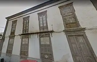 The house that closes the alley barracks[4] was started in the 17th century. Its facade presents the characteristic typology of manor houses of Gran Canaria, in which a stone frame joins the main door with a window located, with windowsill and cornice as decoration. It typically has four drainpipes.