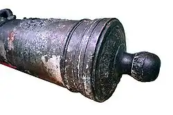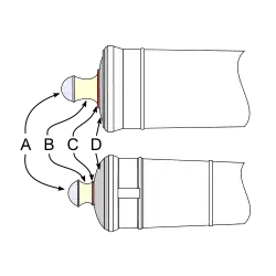 A cannon's cascabel comprises the knob (A) and the neck (B), with some models also having a filet (C). By some definitions the cascabel additionally includes the base of the breech (D). Cascabels varied in design and appearance, and were a common feature of cannons from the 17th century until the advent of the breech loading cannon in the late 19th century. Many naval guns had a heavy metal loop on the cascabel, the pomellion, through which a wide rope was passed.[1]