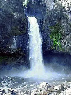 The waterfall is roughly 60–80 feet (18–24 m) high. There is a bridge over the gorge connecting the dense woodland together. On the other side there are two smaller waterfalls that can be seen from some of the footpaths in the area.[2]