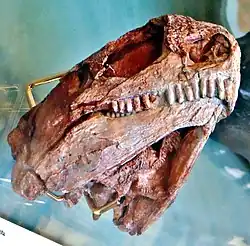 The skull is well-preserved but has suffered of a slight flattening as a result of a tectonic thrust exerted toward the right side and the front. As in other caseid, the skull is small compared to the skeleton (here mainly the forelimbs), and shows very large external nares, a short facial region, and a dorsal surface of the skull dotted of numerous small depressions. In addition, they are many palatal teeth, and the teeth of the upper jaws are numerous (four premaxillary and eleven maxillary teeth) and spatulated with crowns having 5 to 8 cusps.[3] The front teeth, fairly long and slightly recurved, were probably suited to aid in gathering vegetation into the mouth, whereas it is presumed that palatal teeth had to work in conjunction with a tough and massive muscular tongue as indicated by the presence of a very well-developed hyoid apparatus.[4][5]