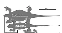 In 2008, a phylogenetic analysis of Caseidae demonstrates the paraphyly of the genus Casea, the French species representing a distinct unnamed genus.[10] Three years later, the species Casea rutena was removed of the genus Casea and assigned to a new genus, Euromycter, in the new combination Euromycter rutenus. In the same article the authors described the larger and stratigraphically younger skeleton from the Cayla Hill, and assigned it to a new genus named Ruthenosaurus.[1]