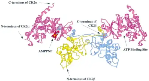 Casein kinase 2 (EC 2.7.11.1)(CK2/CSNK2) is a serine/threonine-selective protein kinase that has been implicated in cell cycle control, DNA repair, regulation of the circadian rhythm, and other cellular processes. De-regulation of CK2 has been linked to tumorigenesis as a potential protection mechanism for mutated cells. Proper CK2 function is necessary for survival of cells as no knockout models have been successfully generated.[1]